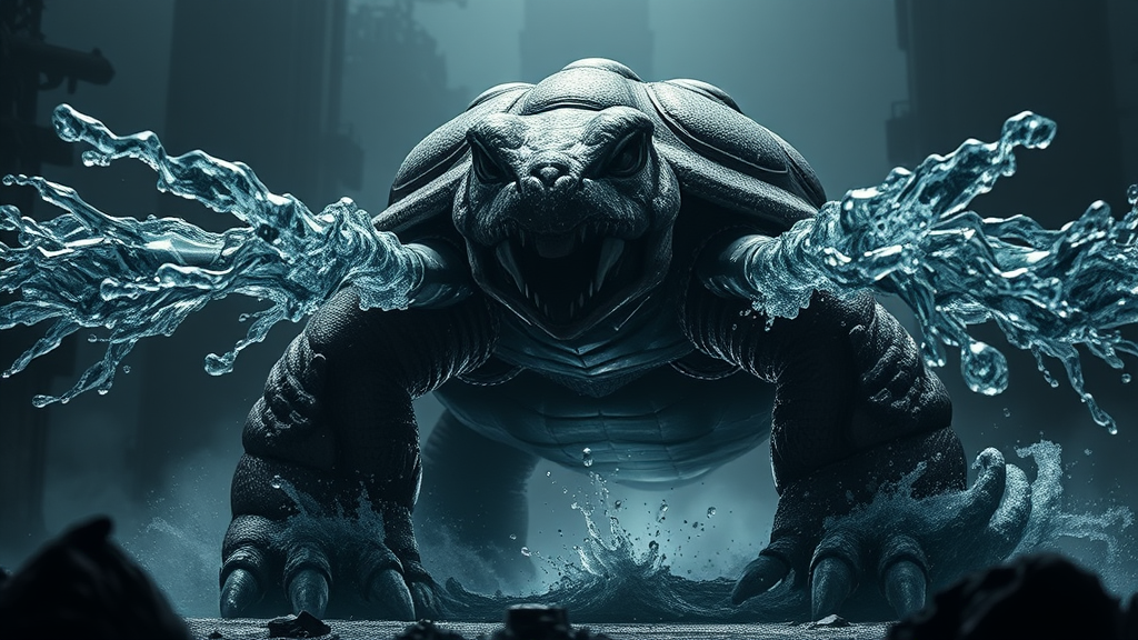 A massive, foreboding dark Pokémon, Blastoise surges forward, embodying a towering monstrous turtle. Its cannons unleash torrents of water with overwhelming force, each droplet glistening in wet, dense waves. The scene unfolds in a twisted, macabre setting, where shadows play with intricate designs and grotesque details. Dramatic lighting casts an eerie glow, highlighting every sinew and shell with hyperrealistic precision. The atmosphere is charged with horror, yet it's mesmerizingly photorealistic and cinematic, drawing the eye to its breathtaking complexity. Shot in 8k resolution, this image captures an epic display of raw, natural power in a format that is both intensely real and vividly imagined.