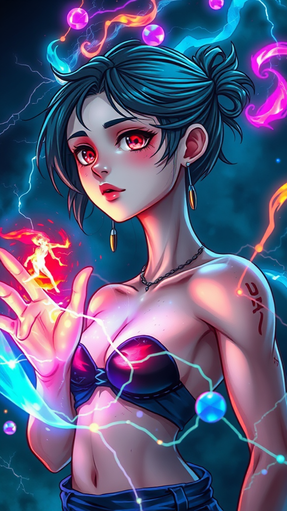 A dreamy portrait of a young girl wielding magic with elements of lightning, fire, ice, water, and wind, set against a mysterious nocturnal backdrop. The scene features glowing colors and volumetric lighting, with iridescent, opalescent wires and earrings adding to the mystical ambiance. The girl's face is artistically smudged, and her features, including a long neck, are depicted in a stylized manner reminiscent of anime and cartoon influences. The setting exhibits a fantastical quality, with low-resolution sketches blending into the scene, creating an aura of mystery. The character's red eyes and muscular build are striking, complemented by skin spots and blemishes that add a touch of realism. Despite elements of imperfection, such as unusual anatomy and disproportioned limbs, the artwork captures a surreal beauty. The magical essence is enhanced with swirling elemental powers and iridescent hues, harmonizing with the enchanting and otherworldly dreamscape.