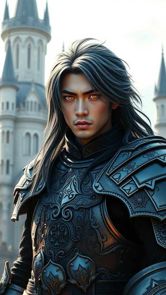 A striking medieval fantasy portrait features a handsome Asian warrior clad in intricately designed armor, standing resolute against the backdrop of a majestic fantasy castle. The bright morning light casts an ethereal glow from the side, enhancing his black and silver hair that cascades like molten metal. His eyes radiate an electric luminescence, charged with an unnerving vitality, while his expression holds a hint of unsettling intensity.