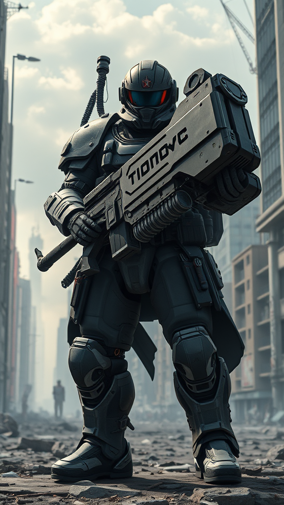 Futuristic Soviet soldier clad in a sci-fi battle suit grips an enormous warhammer with a massive energy gun, standing confidently in a dystopian cityscape; anime-inspired graphics and manga-style detailing render the scene with high precision; dark, rich colors dominate the offset printing poster; elements of 8K quality enhance the realism, capturing the shadows and highlights provided by natural lighting.