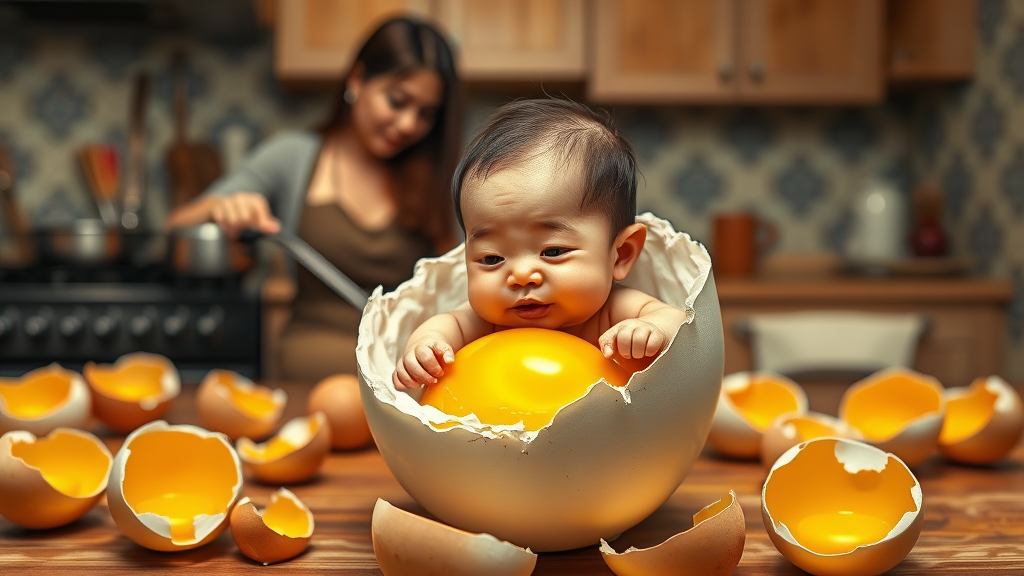 A highly detailed, realistic-caricature of a big-headed baby with the face of an Indonesian adult man emerging from a freshly hatched egg, holding onto the edge of the eggshell, surrounded by the bright yellow yolk. In the background, a kitchen is visible with several broken eggs of similar size scattered around, hinting at a breakfast scene. A woman is cooking at the stove, her focus partly on the man-faced baby, adding a humorous touch to the setting. The composition is captured in Ultra HD, 5k, highlighting the intricate details and vivid colors.