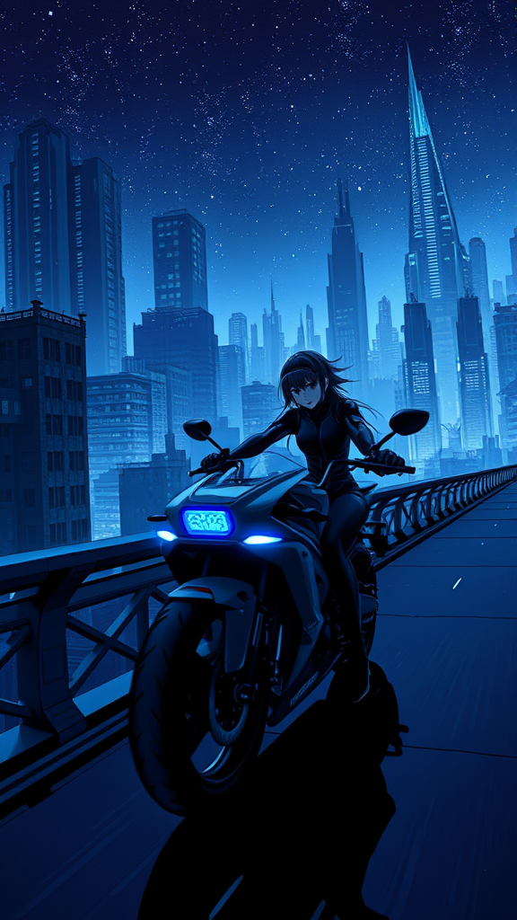 A girl in a sleek sci-fi jumpsuit rides a neon-lit motorcycle across a futuristic bridge, silhouetted against the ruins of a towering sci-fi city. The scene evokes the essence of Akira and Tsutomu Nihei's work with its dark, intricate, and multistory architectural aesthetic. The cityscape looms with colossal skyscrapers, reflecting a post-apocalyptic world where glimmers of advanced technology remain. The starry night sky casts a mystic glow, complemented by the motorcycle's blue energy plumes and glistening blue neon lights. This anime-style drawing captures the dynamic and detailed perspective of a first-person view, bathed in blue tones and dark exposure. The art embodies the highest quality and detail, with an 8K Full-HD resolution that highlights every nuance of the manga graphics and futurism theme.