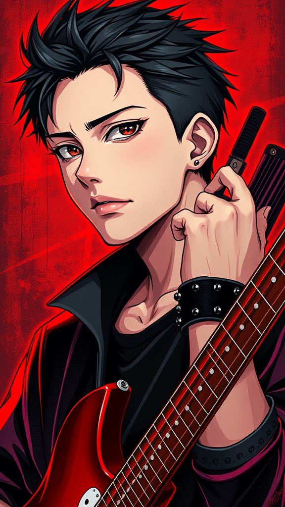 A captivating and mysterious portrait of an enigmatic anime boy, illustrated in the style of a Da Vinci drawing. He holds a sleek, edgy guitar that hints at his deep connection to rock music. The boy's dark black hair is styled with subtle yet rebellious spikes, complementing his punk-inspired wristband adorned with metal studs. His cool, unyielding attitude is accentuated by the neon red and hot black color palette that bathes him in an electric aura. The focus is on his intense, thoughtful gaze, conveying a sense of depth and stoicism, all captured with an artistic flair reminiscent of classical artistry.