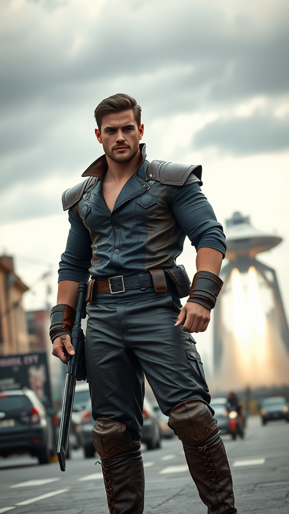 Craft a scene featuring an ultra-realistic full-body portrait of a 28-year-old Israeli Caucasian male. The subject exudes a dominant aura, embodying strength and confidence in a hero pose with an ubermensch vibe. He stands as if part of an elite military unit, styled in breeches and a leather uniform with tall leather driving boots. His physique is muscular with a hairy chest, a sharp jawline, and a smaller head topped with shiny hair. The setting is a bright NYC day, transitioning creatively to a spaceport where a sci-fi ship is launching in the background under an overcast sky. The image captures a cinematic quality with soft, natural lighting and moody, vibrant tones. Admirable details include his handsome pale skin, detailed leather armor reminiscent of a stylized warrior. Natural textures and photo realism are conveyed through the cinematic rendering using techniques such as ray tracing, emphasizing action and epic atmosphere with high detail and quality.