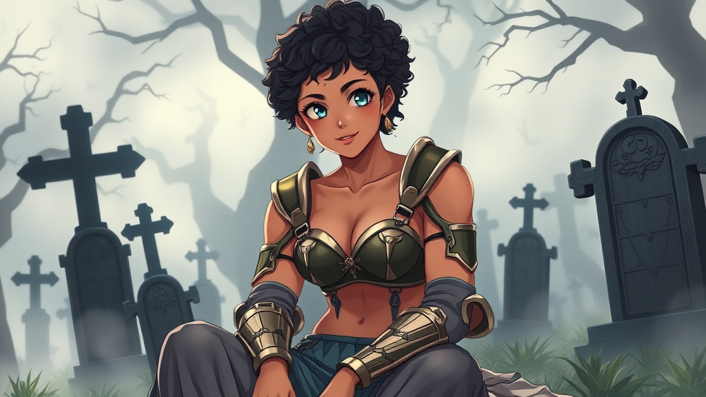 Anime full body depiction of a 24-year-old Walloon-Māori female with a girl-next-door beauty, exuding a warm, inviting expression. Her light olive skin takes on a golden hue in the summer. She wears subtle makeup, a hint of blush on her cheeks, and a natural pink shade on her lips. Her infinity-shaped eyes are radiant and pale blue, framed by long, elegant eyelashes. She has a curly afro and neatly shaped eyebrows that complement her delicate facial features. Her firm, muscular shoulders have a rounded shape reminiscent of female bodybuilding. She is adorned in mermaid-themed armor with a midriff and Samurai Battle Hakama, sitting on her knees in an eerie, fog-covered graveyard with haunting spirits in the background. The style is inspired by Masashi Kishimoto with unique creative touches.