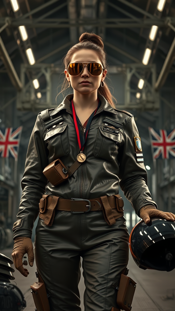 A heroic female mechanic stands confidently in a spacecraft hangar, her intricate and highly detailed formal Oak Cool Pewter leather uniform glistening under the sci-fi, cyberpunk lighting. She wears medals and a utility belt, her dynamic action posture captured in a dramatic low angle shot. The golden pilot sunglasses on her face reflect the highest facial details, making her a masterpiece in 8k resolution. Surrounded by dark, realistic fabric details and folds, she handles futuristic tools with precision. The simple, monochrome background has low contrast, adorned with hard surfaces and subtle flags representing the stars and stripes and the union jack. The atmosphere is cinematic, showcasing a true professional in her element, with her helmet nearby amid an electrically charged ambient noise, yet remaining SFW and tastefully captured.