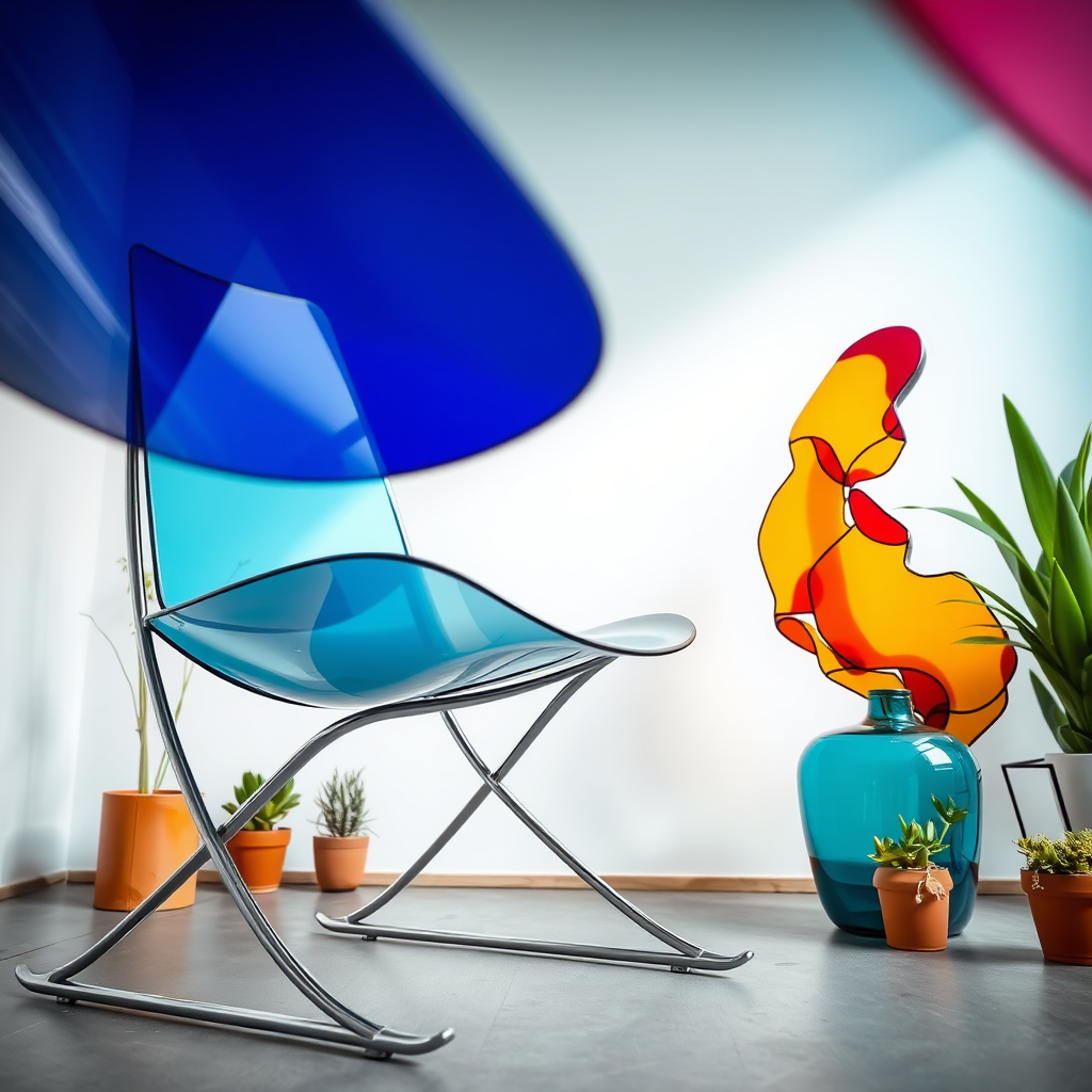 Contemporary chair design, studio environment, close-up perspective with 90mm lens, featuring sleek steel and vibrant colored glass materials, complemented by a few potted plants and an intriguing abstract sculpture.
