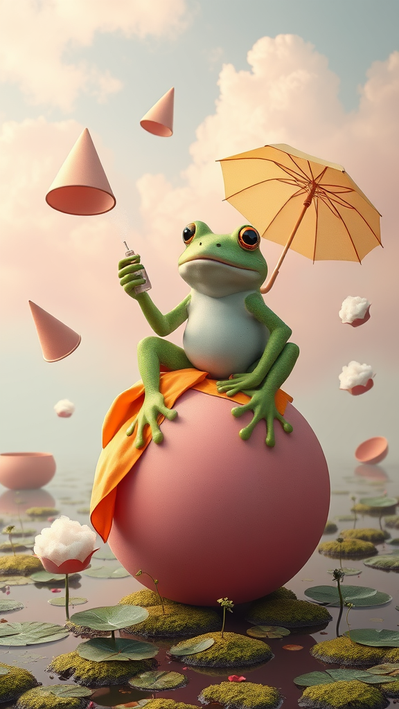 A serene scene unfolds with a large, emerald-green anthropomorphic frog perched gracefully on a pink ball draped with an orange silk cloth. The frog, maintaining a calm yet curious expression, holds a yellow umbrella aloft in one hand, while the other gently grips a tiny spray bottle emitting a subtle mist. Surrounding this tranquil character are an array of floating, abstract forms, including cone-shaped objects in hues of soft pink and vibrant yellow, and a delicate bowl cradling a fluffy, cloud-like substance. The backdrop is painted with a pastel sky, a dreamy mixture of gentle pink and blue wisps of clouds, while the ground below echoes a whimsical swampy scene with mossy textures, floating lily pads, and diminutive sprouting flora. The entire composition radiates a whimsical, dreamlike quality, bathed in soft illumination, evoking an atmosphere that is both playful and fantastical.