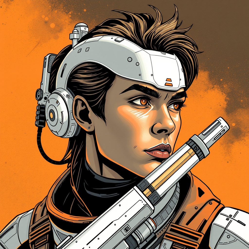 sci-fi illustration by Roblunda McCallum, featuring intricate blink-and-you-miss-it detail, full character portrait in dark white and light orange tones, blending sci-fi realism with a pulp comic aesthetic, reminiscent of classic airbrush and comic art techniques, high aspect ratio 31:64, stylized sophistication reaching level 750, version 6 with unique creative twists