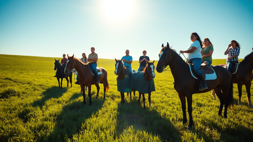 A group of enthusiastic students are learning the art of horse riding in an expansive green field, capturing a still frame from a movie with the bright midday sun casting gentle shadows. The scene is vibrant and lively, with the sun highlighting the students' determination and joy. Lush grass stretches out beneath the hooves of the horses, while the clear sky adds a touch of brilliance to the overall atmosphere. This picturesque moment embodies the spirit of adventure and the thrill of learning something new.