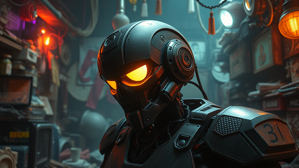 Masterpiece ultra high res wide angle shot in a chaotic and cluttered hideout, dynamic scene, League of Legends inspired, vibrant and photorealistic with a dramatic and dark tone, sharp focus, 8k resolution. A robot shattered into pieces, glowing yellow visor, styled as a sci-fi cyberpunk gangster, medium shot. Intricately designed using Unreal Engine, cozy indoor lighting reminiscent of James Gurney and Katsuhiro Otomo, filled with cinematic charm. Vivid nature elements interwoven, with influences by Craig Mullins and Greg Rutkowski. Enhanced by volumetric lighting, trending aesthetic on ArtStation, rendered with Octane for precision. Each detail sharpened in a studio-like environment, deeply detailed capturing the essence of Cyber 2077.