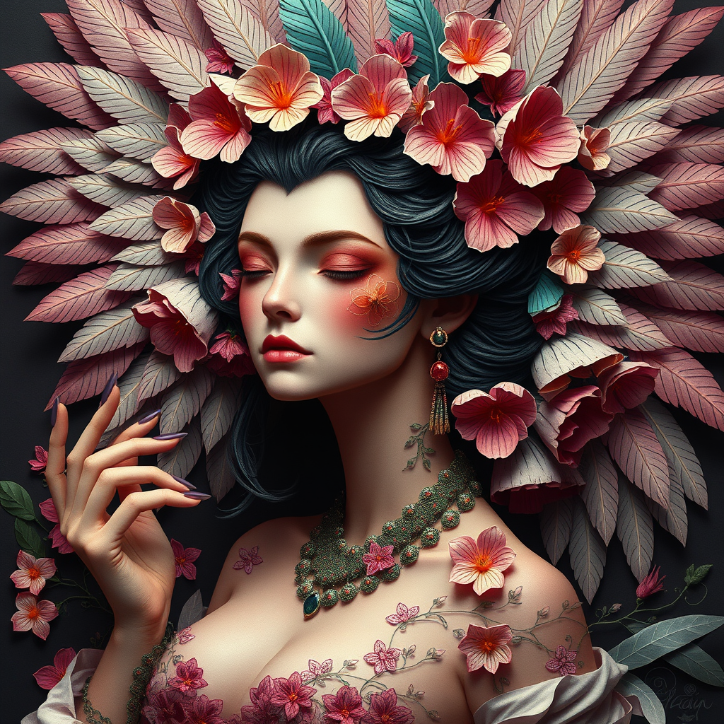 Voluptuous concubine adorned with feathers and flowers, inspired by the paper craft style of Ernst Haeckel and Maria Sibylla Merian. Blending influences from Tristan Eaton, Victo Ngai, Artgerm, Rhads, Ross Draws, Kaethe Butcher, Hajime Sorayama, Greg Tocchini, and Virgil Finlay. Infused with a sci-fi aesthetic featuring vibrant colors and neon lights. Created as a digital painting in the style of Ilya Kuvshinov, capturing details in 8k UHD and HDR. The artwork includes imaginative elements like a long neck, extra fingers, and a touch of mutation for a surreal feel. Avoiding any low-resolution or distorted qualities while ensuring clarity and depth, with no watermarks or text distractions. The composition stays focused on a single cohesive image, maintaining artistic integrity and originality.