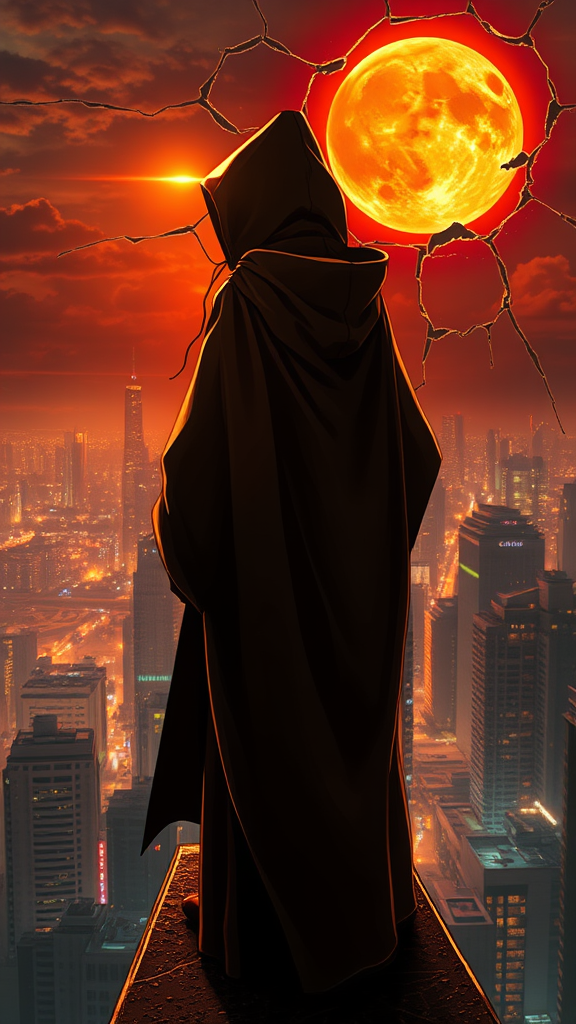Masterpiece, highest quality, a golden sea wave glistening under a bright orange sunset piercing through the crest, shimmering golden droplets suspended in air, a lone girl poised on the edge of a rooftop, gazing across a neon-lit cityscape at night. Stylized urban fantasy art meets dark cyberpunk, featuring a mysterious figure in a hooded Sith Lord's robe, adorned with a futuristic sci-fi cape. The backdrop reveals a haunting blood moon, set against a sky that appears to peel and crack, unveiling surreal vistas. The scene is infused with extreme detail and hyper-realistic textures, digitally crafted with cutting-edge technology. This mesmerizing tableau, steeped in dramatic lighting, brings forth a unique fusion of modern science fiction anime with an emphasis on cyberpunk aesthetics, captured in Unreal Engine 5's revolutionary rendering capabilities. The city below pulsates with a vibrant life, accentuating the surreal broken sky, as the scene blends realism with fantastical elements, evoking a sense of awe and wonder.