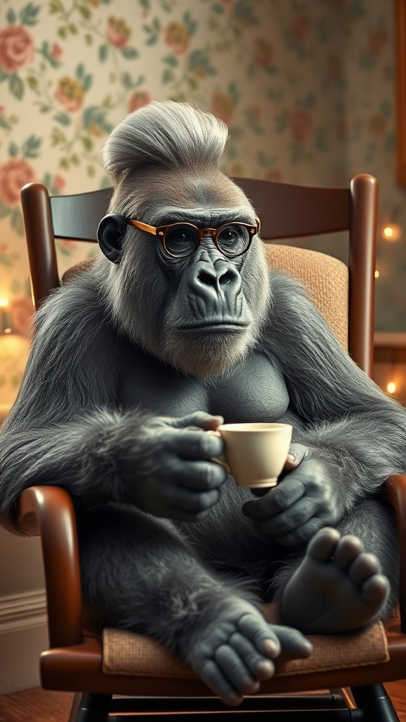 A distinguished gorilla with silvery gray hair elegantly styled in a bun, donning vintage spectacles, is seated comfortably in a classic rocking chair. The room is adorned with charming floral wallpaper, creating a cozy atmosphere. The gorilla gently holds a delicate teacup as warm, inviting lights cast a soothing glow around the space. The scene exudes a sense of tranquility and refined elegance, enhanced by the subtle warmth of the lighting.