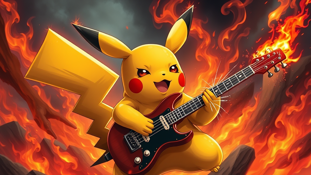 Anime-inspired, hyper-realistic Pikachu amidst swirling flames passionately strumming an electric guitar, sparks flying from the strings, with an intense expression that reflects both focus and joy, against a backdrop of a dynamic, fiery landscape.