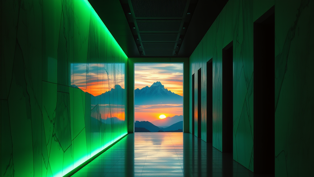 Futuristic passageway with neon emerald illumination, featuring geometric alabaster walls and a framed view of a mountain vista at sunset. The scene is a silhouette in contrasting light and shadow, capturing the essence of architectural photography with a sci-fi ambiance. Enjoy a dramatic perspective and the serene beauty of azure blue mountains.