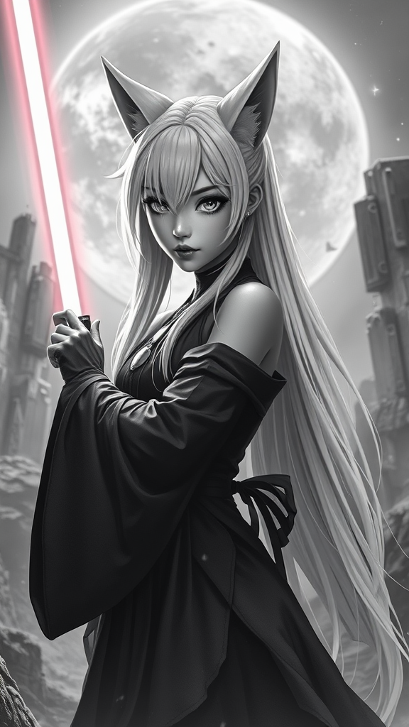 Asian girl Sith lord with striking white hair and elegant cat ears, radiating a powerful presence. She stands in a hyperdetailed, dynamic pose that showcases her mastery. The immersive background envelops her in an intricate grayscale landscape, with a subtle depth of field enhancing the monochrome ambiance. The artwork is a masterpiece rendered in 8k quality, capturing her essence with remarkable precision.