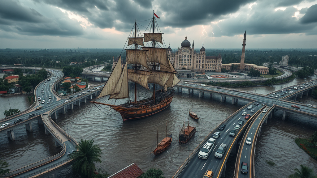In a striking juxtaposition of past and present, a hyper-realistic bird’s-eye view reveals a 16th-century pirate ship inexplicably marooned amidst a flooded highway in Makassar, Indonesia. The ship, battered by the harshness of time, displays towering sails, tattered and weather-beaten, while its once-vibrant wood and paint have been stripped to a faded relic of its former glory. Encircling the ancient vessel, floodwaters have consumed the streets, and elevated overpasses are jammed with cars, stalled by the relentless downpour and the ensuing traffic chaos. Looming in the backdrop is the imposing University of Makassar, standing sentinel against the elements, while nearby, several traditional Pinisi ships and smaller boats drift aimlessly in the swelling currents. The atmosphere is electric and turbulent; ominous dark clouds blanket the sky, occasionally pierced by dramatic streaks of lightning that flash across the scene. Torrents of rain cascade down, enveloping the city in a misty shroud, with ripples distorting the watery mirror reflecting this surreal tableau. The ancient ship, surrounded by the modern metropolis ensnared in flood-induced gridlock, alongside the floating fleet of Pinisi, casts a cinematic and almost dreamlike spell. This evocative scene of storm and flood, the historical ship within a contemporary setting, stirs a visceral awareness of nature's raw power and the unexpected convergence of different eras and environments.