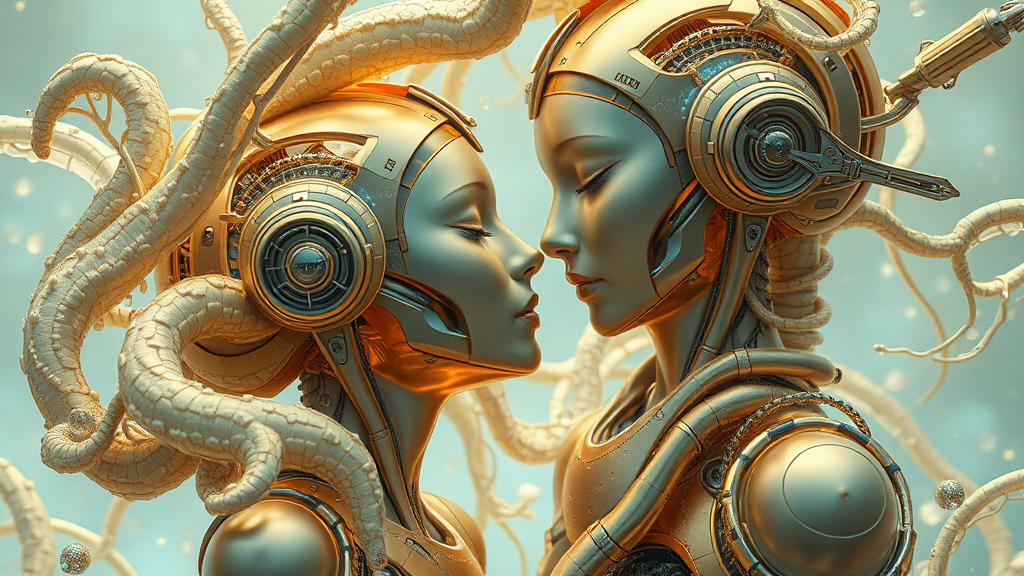 Imagine a hyper-realistic sci-fi setting where romantic fantasy comes to life through the illustrations of a visionary visual artist. Inspired by Franciszek Starowieyski, this scene is depicted in a rich palette of gold and cyan, capturing the beauty of organic sculpting in a futuristic world. The artwork combines elements of romance and fantasy, bringing together elements of android technology with an ethereal touch. The composition has an aspect ratio of 32:31, maintaining a serene yet dynamic atmosphere. The piece is given a surreal touch akin to works by Android Jones, evoking a sense of wonder and elegance within this imaginative universe.