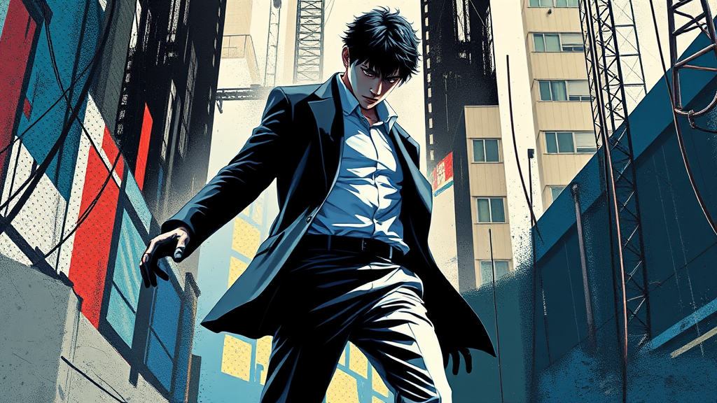 A dynamic movie poster design featuring a male character dressed in a striking combination of black, white, and blue. The artwork channels the vibrant, collage-inspired style reminiscent of Yoh Nagao, with an emphasis on interplaying light and shadow. The composition is tall and sleek, exuding a sense of movement and intensity. The background incorporates abstract urban elements, with bursts of geometric shapes and textures that highlight the character's stance and expression. The lighting dramatizes the scene, enhancing the character's bold silhouette against a backdrop that hints at mystery and action.