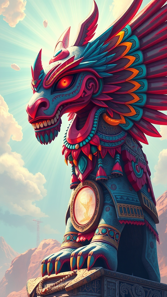 totem animal aztek tribal style vibrant fantasy fanart ornate heartstone ankama gta5 cover style depicted in the art of Jesper Ejsing, RHADS, and Makoto Shinkai combined with the vivid imagination of Lois van Baarle and Ilya Kuvshinov, featuring RossDraws’ dynamic style. The piece radiates with pastel colors, emanating a glowing aura. It's intricate and elegant, with sharp focus. Imagine the digital painting with a concept art vibe as if crafted by WLOP, Artgerm, Greg Rutkowski, and inspired by the elegance of Alphonse Mucha. The artwork is a masterpiece, rendered in high definition, balancing sharp contemporary style with ethereal elements, creating an awe-inspiring totemic vision.