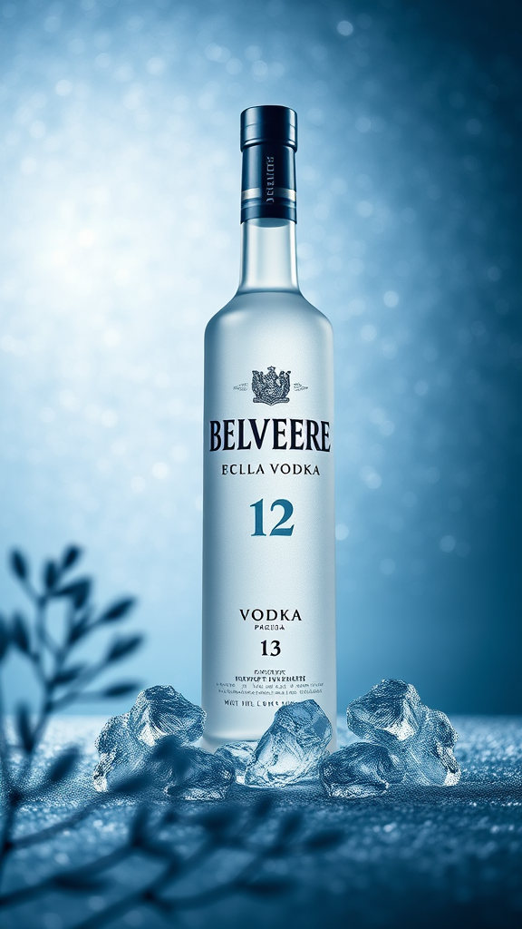 A sophisticated and elegant ad campaign for Belvedere Vodka, featuring a sleek and frosted bottle of Belvedere positioned against a backdrop of shimmering silver and cool blues. The bottle catches the light, highlighting its iconic design and pristine appearance. Delicate ice crystals surround the base, enhancing the sense of cold purity. In the foreground, a subtle hint of nature is suggested with abstract reflections of birch trees, nodding to the vodka's unique heritage. The overall composition exudes luxury and refinement, with a modern, artistic flair.