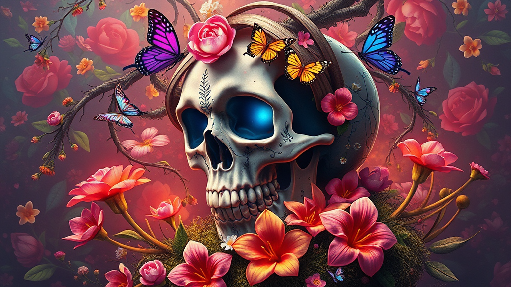 A vibrant skull adorned with blooming flowers and fluttering butterflies, surrounded by intertwining vines and lush moss, set against a rich tapestry of floral background. This intricate digital painting is reminiscent of Chris LaBrooy's style, blending psychedelic and poster art elements with a glowing, atmospheric aura. The composition, rendered in 8k using advanced techniques in Cinema 4D and Blender, captures a dark yet whimsical mood with remarkable ultra-detailed craftsmanship. It marries the cinematic sensuality of Ed Blinkey’s oils with the vivid realism of Antonio Moro and Jeremy Mann, trending on platforms like ArtStation and CGSociety. This hyperrealistic artwork, echoing the expertise of artists like Greg Manchess and Greg Rutkowski, features a humorous, sharp-focused illustration with a majestic, intricate depth of field. Bright, vivid colors and a model-shoot style bring the composition to life, creating a masterpiece of concept art that is both dramatic and photorealistic, devoid of any distortions or unnecessary elements.