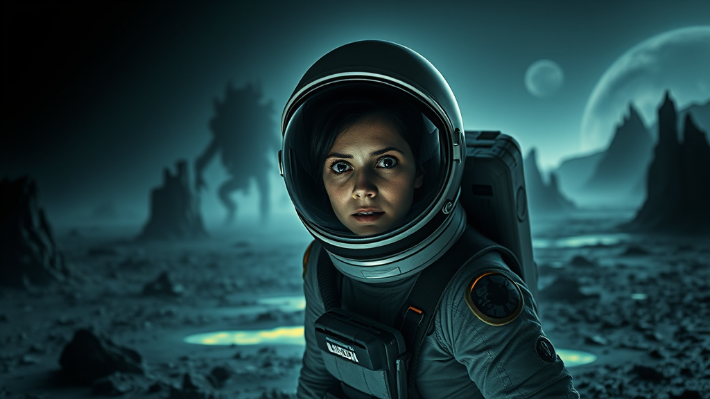 An astronaut stares through her helmet with wide, terrified eyes as an eerie creature looms behind her, its shadowy form barely visible in the dim, humid atmosphere of the alien planet. The desolate landscape is drenched in darkness, the ground slick with a strange, luminescent moisture that casts an unsettling glow. Jagged rock formations rise ominously from the mist, their silhouettes distorted and foreboding in the faint light. In the distance, a chilling wind howls through the barren terrain, intensifying the sense of dread enveloping her as she frantically searches for escape from the relentless, otherworldly predator.