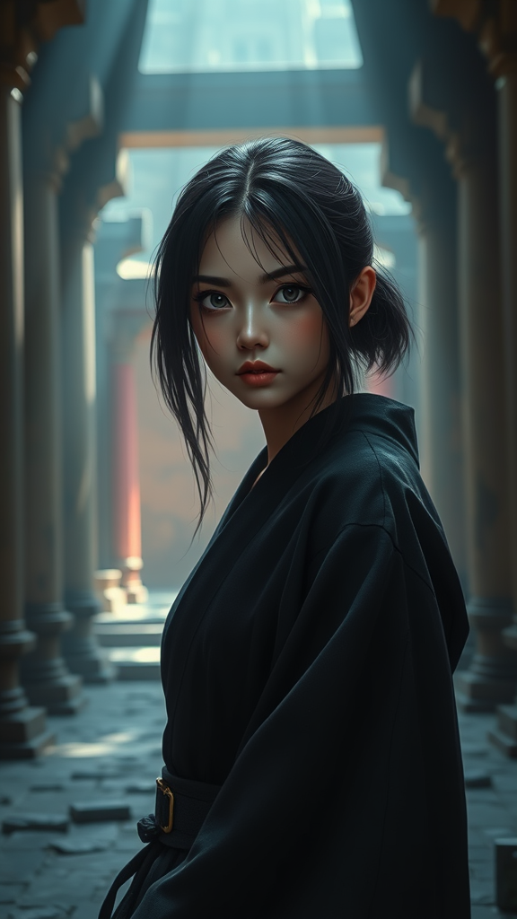 A female character in dark robes stands within an ancient temple, her gaze steady with perfectly symmetrical eyes. Bathed in dramatic lighting, the scene is captured in high-definition with sharp focus. The highly intricate details bring a hyperrealistic touch to the composition, utilizing advanced physics-based rendering and raytracing techniques. Her pose is dynamic and engaging, blending the lines between photography and digital art. The image merges elements of CGI, 3D modeling, and traditional drawing, creating a seamless blend that echoes both cartoon and anime influences, culminating in a striking digital painting marked by realism and complexity.