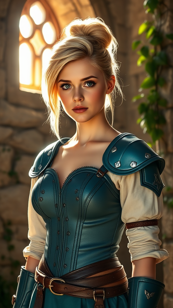 A stunning portrait of a captivating young woman, set in a medieval RPG world, features her standing solo indoors bathed in bright morning light streaming from the side. Her striking blonde hair is elegantly styled in an upswept updo, embodying the allure of a swashbuckler rogue. She is clad in a corset shirt paired with delicately crafted teal armor, exuding an air of both grace and strength. The room around her is slightly overgrown, with ivy creeping along stone walls, adding a touch of nature to the setting. Her eyes, full of mystery, reflect the adventurous spirit of the era.