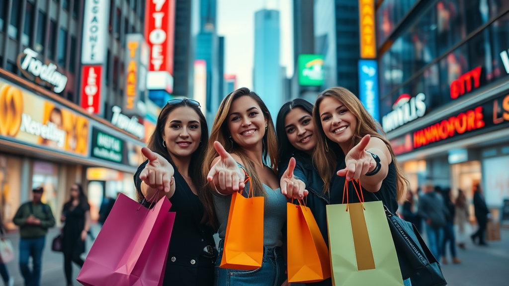 A cinematic photo capturing a trio of women in a bustling urban setting, standing together on a lively downtown street; their expressions are a mix of confidence and joy as they extend one hand toward the camera, while the other holds colorful shopping bags, the city skyline and neon lights create a vibrant backdrop.