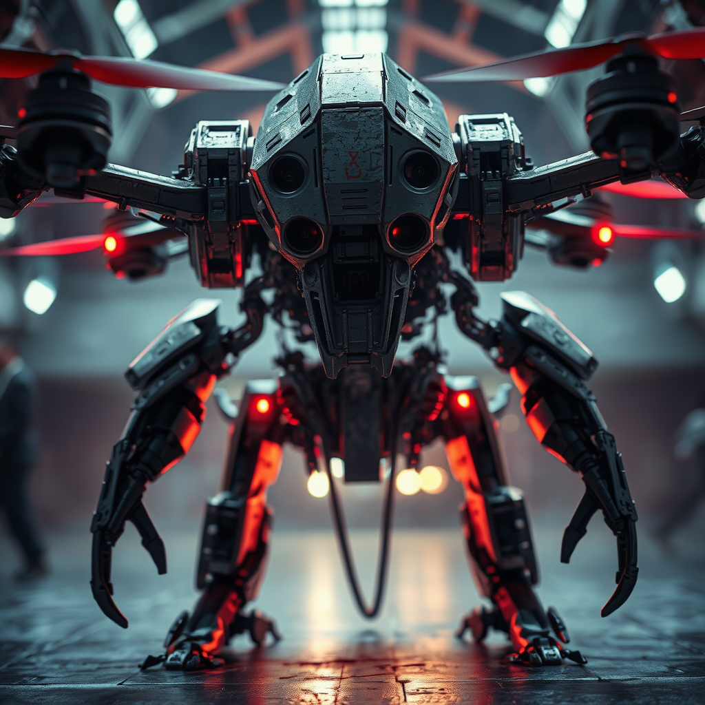 Sci-Fi drone futuristic robot MACHINE BUMPER, HDR, full-body, dramatic, intense cinematic composition, dynamic lighting, vivid color grading, focused roughly drawn cathedral robot, mutation, mutated, deformed, warped, disfigured, unsightly, repulsive, blurry, incorrect anatomy, baroque, Manet-inspired, cartoon-like, sketchy, abstract, low quality.