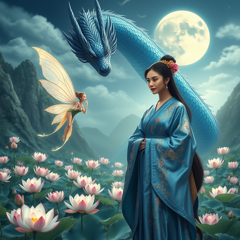 In a mystical Chinese landscape, a graceful fairy with shimmering wings floats delicately amidst a field of blooming lotus flowers. Beside her, a regal woman clad in flowing silk robes adorned with intricate embroidery stands with an aura of calm and wisdom. Above them, an iris blue dragon, its scales glinting like sapphires under the moonlight, coils through the sky. The dragon's eyes, sharp and penetrating, fix on the woman with a fierce intensity, their mutual gaze hinting at a deep, enigmatic connection.