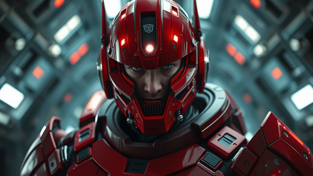 A cinematic ultra-wide photo captures a fierce sci-fi warrior clad in intricate red armor, featuring a sophisticated cyber helmet adorned with glowing lights. The full insulated armor exudes strength and power, showcasing an active pose of a determined combatant reminiscent of Optimus Prime. The warrior's bald head and the abundance of fine detail in the armor's design enhance the futuristic aesthetic. Set against a moody spaceship backdrop, the scene is bathed in natural and cinematic lighting that emphasizes the dark, sci-fi movie style. The use of advanced ray tracing techniques contributes to the photorealism and highest quality rendering in 8K Ultra-HD. The photograph, presented from a third-person view, incorporates a subtle blur effect and long exposure, adding to the cinematic depth and dynamic energy of the moment.