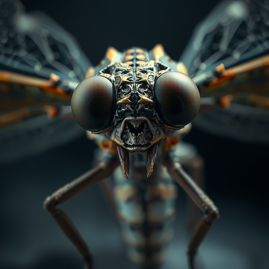 A cinematic, hyper-realistic macro image of an ancient, humanoid grotesque dragonfly, featuring a tarnished, ancient exterior with elaborate patterns and textures. Its large eyes are open wide, showcasing an intricate and mesmerizing internal structure. The dragonfly's extended wings reveal a delicate network of veins, creating an ethereal glow. The dark, abstract background remains blurred, drawing focus to the dragonfly as the captivating central subject, accented by soft, ambient lighting to enhance its details.