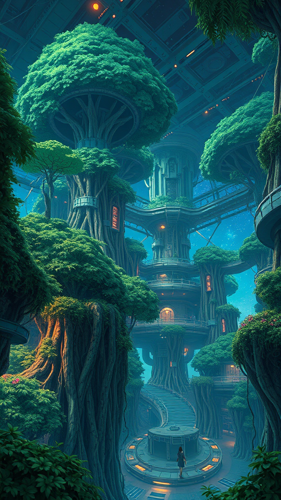 Imagine an expansive sci-fi space station teeming with lush vegetation, where towering trees weave their roots into the surrounding walls, creating a symbiotic relationship. This massive multistory environment houses gargantuan plants, their vibrant foliage contrasting against the backdrop of the infinite cosmos. The scene is set at dusk, casting a dystopian yet mesmerizing ambiance. The artwork, inspired by Tsutomu Nihei's distinctive style seen in Blame! and Sidonia no Kishi, embodies intricate anime and manga graphics, featuring countless fine details. Hyper-detailed and of the highest quality, the scene is illuminated by a dynamic mix of flashing and ambient lighting. A third-person perspective reveals the interplay of natural and technological elements, with optical fibers subtly interwoven throughout, presented in stunning 8K Ultra-HD.