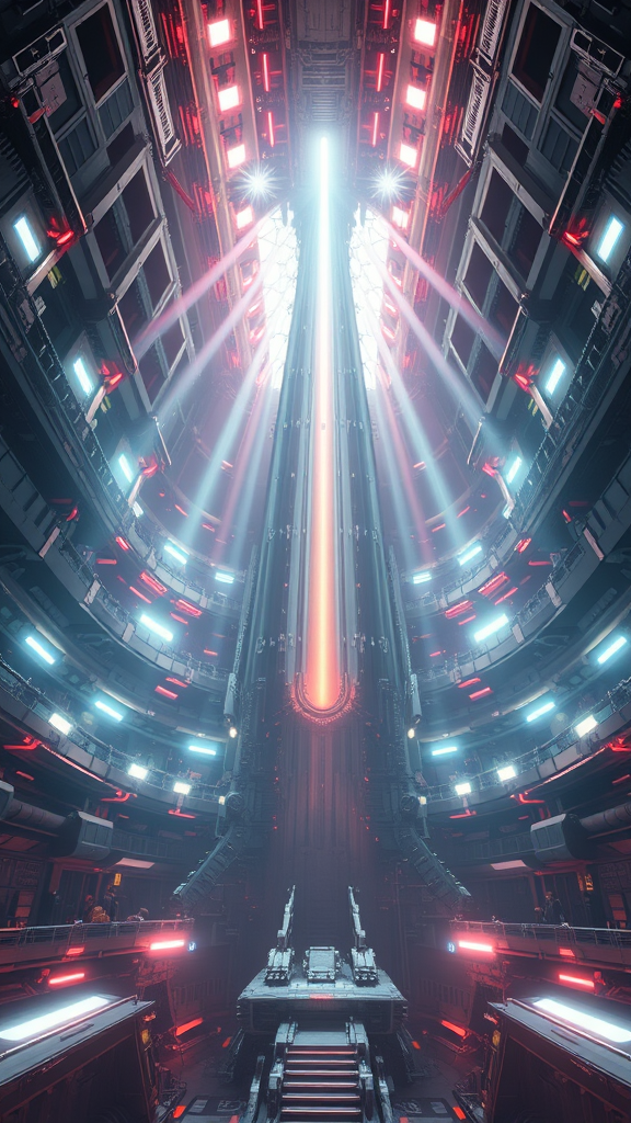 In the interior of a colossal spaceship, inspired by the style of Tsutomu Nihei and the essence of Sidonia no Kishi, the scene unfolds with a sense of awe-inspiring gigantism. A massive laser generator dominates the multi-story space, emanating vivid beams of light that cut through the air with futuristic precision. The architectural design is steeped in sci-fi aesthetics, featuring hyper-detailed elements that captivate the imagination. At the heart of this spectacle, a central laser beam reaches down from what seems like the sky, its energy clots pulsing with intensity. The scene is alive with the sensation of acceleration and light flashing at incredible speed, capturing the essence of anime and manga graphics. Rendered in 8K HD super-resolution, every detail of this futuristic marvel is brought to life with an unyielding clarity.