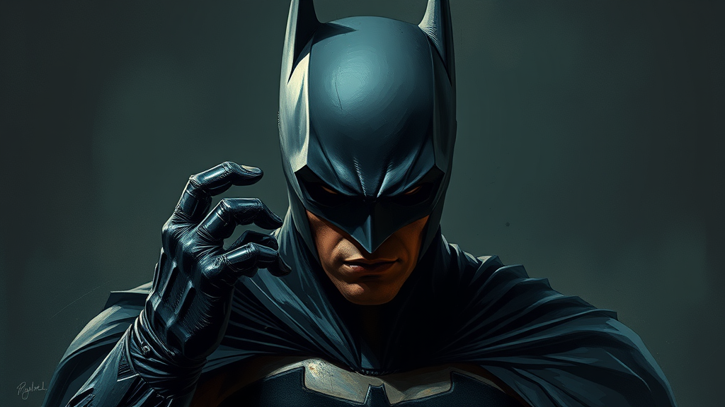 Digital wallpaper portrait of Batman, the Dark Knight, in a comic-style depiction with 8k resolution. The artwork features a rough, Marvel comic-inspired look, capturing a desperate and brooding mood. Set against a dark background with muted colors, the composition is epic and dramatic, showcasing a digital painting that is emotionally profound and highly intricate. The image has JPEG artifacts and an intentionally low-quality appearance to enhance its gritty feel. Artistic imperfections such as poorly drawn hands and face, mutations, deformations, and blurred elements contribute to a morbid and unsettling aesthetic. The anatomy is intentionally distorted with bad proportions, extra limbs, cloned features, and disfigured appearance. The portrayal includes elongated neck features, missing or extra body parts with grossly malformed limbs. The image includes elements like signatures, watermarks, or logos, with some features cut off or censored, all contributing to the depiction of a character in a visually chaotic yet compelling manner.