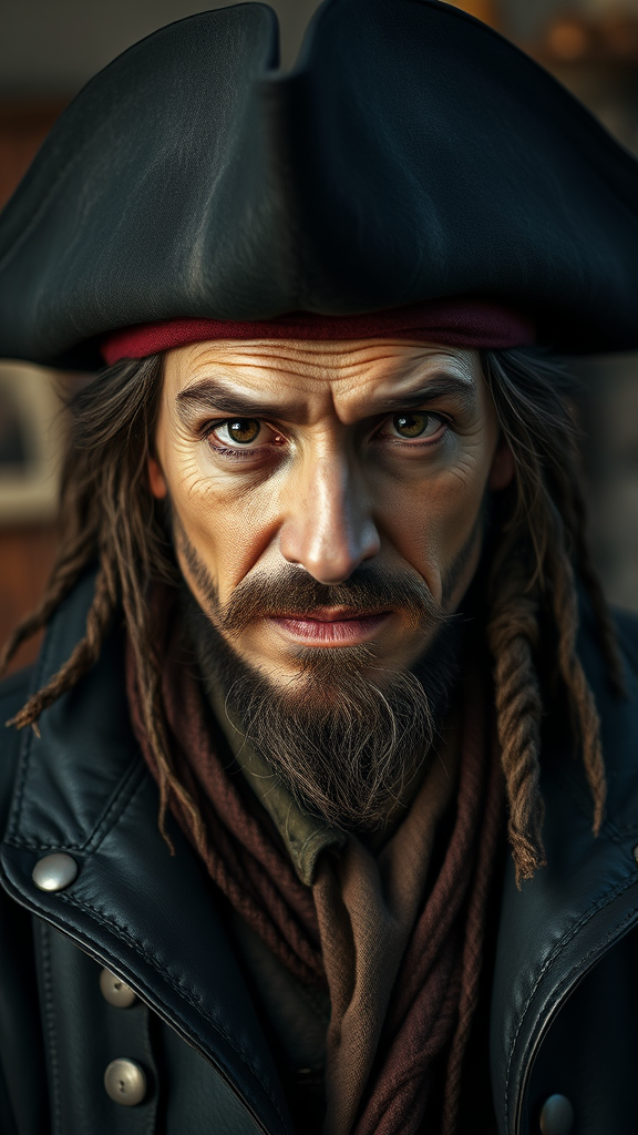 A detailed portrait of a pirate, featuring an intimidating and weathered face marked with deep wrinkles emanating from the mouth and cheeks. His hair is dark, greasy, and chaotic, laden with the essence of realism and physics, topped with a misshaped black felt hat exuding a sense of adventure and mystery. The pirate dons an intricately designed leather coat suited for winter chills, adding layers to his formidable persona. His gaze carries a gloomy intensity, capturing the viewer's attention with a piercing focus that melds artistry and emotion. The composition is centered, presenting a promotional art style with high precision, detail, and sharp focus, drawing inspiration from the works of Alessandro Casagrande, Greg Rutkowski, and Sally Mann. Set against a cozy indoor backdrop, the scene is bathed in diffused lighting that mimics the magical hues of a sunset, enveloping the portrait in soft, cinematic light. Shot with a f/1.8 aperture at 85mm, the image is a medium shot capturing every nuance of the subject in exquisite detail. The inclusion of volumetric fog introduces an ethereal quality, reminiscent of trends seen on platforms like Tumblr, while employing HDR technology to achieve 4k clarity and 8k resolution. The portrait combines elements of portrait photography, magical realism, and dramatic lighting, achieving ultra-detailed, photorealistic imagery with octane-like vibrancy, ensuring the pirate's enduring presence is both awe-inspiring and haunting.