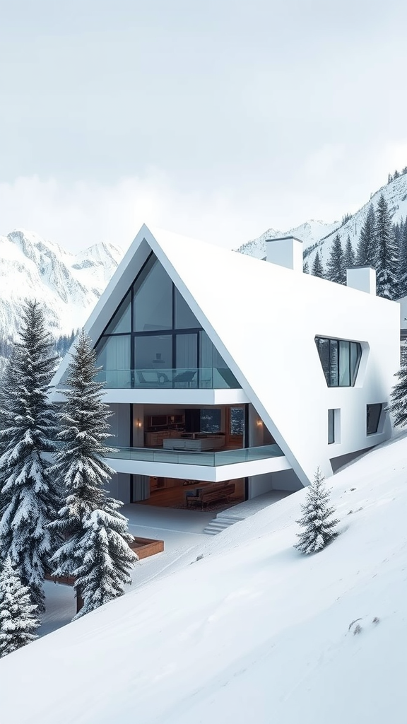 A futuristic luxury Swiss retreat perched on a mountainside, boasting sleek white facade with expansive triangular windows and gracefully curved structures. Nestled amidst snow-dusted pine trees, this architectural marvel combines modern materials with wood and concrete elements. Its minimalist design features open-plan living spaces, vast glass walls, and a rooftop deck offering breathtaking panoramic views of the surrounding peaks. This visually striking home reflects the innovative styles of Bjarke Ingels, Zaha Hadid, and Frank Gehry with clean lines and intricate attention to detail, exuding a sense of serene modernity and unique sophistication.