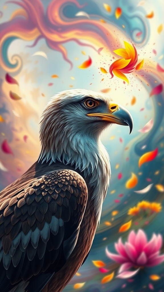 Eagle with an elongated beak viewed from the side, its keen eye focused amidst a swirling fantasy landscape. The abstract background bursts with vibrant colors, reminiscent of flower petals caught in a gentle breeze. The scene exudes a sense of movement and color, as if the wind itself paints the sky with a myriad of hues.
