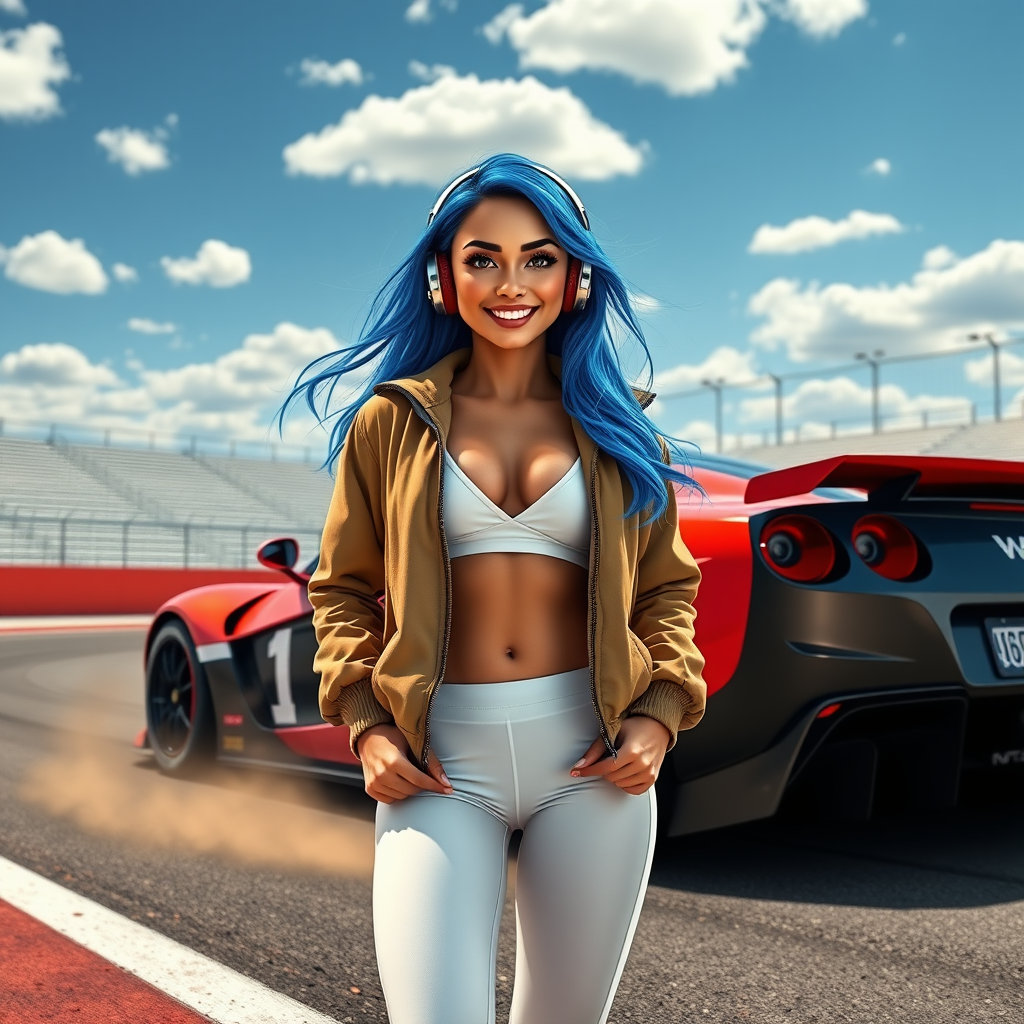 A full body portrait of a stunning racecar woman standing beside a sleek red race car on a race track, with tanned skin and flowing long hair. Her symmetrical face displays a bright smile, accentuated by dark eyebrows and mascara. She wears an open jacket over white yoga pants, against a backdrop of bleachers under a blue sky with scattered white clouds. The scene is illuminated with detailed lighting, including rim lighting and dramatic chiaroscuro effects. Dust particles are subtly visible in the air, adding to the dynamic atmosphere. The image captures elements of John Constable's composition and Jeremy Mann's detailing, trending on ArtStation and CGSociety. Her vibrant blue hair is styled uniquely, drawing inspiration from Iron Mouse, and she wears stylish headphones. The artistic rendering combines realistic and animated features, with influences from Makoto Shinkai's vibrant colors. The entire scene is intricately detailed and highly refined, showcasing expert artistry and imagination without any flaws or distortions in anatomy.