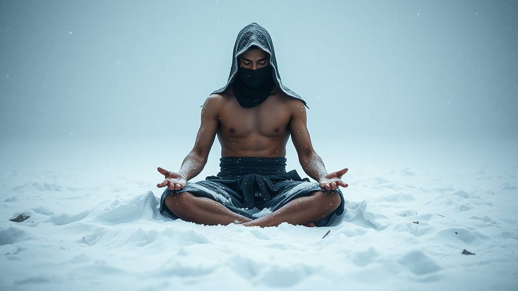 A hyper-realistic, cinematic image captures a lone ninja in deep meditation amidst a fierce blizzard, his form partially enveloped by the accumulating layers of snow. Clad solely in traditional Japanese fundoshi, the ninja's bare skin is tinged with frost and lightly dusted with snow. Seated cross-legged, his hands rest calmly on his knees, exuding an aura of unwavering peace. Despite the relentless snowfall and howling winds, the ninja remains motionless, allowing snow to mound upon his shoulders, arms, and legs, creating a striking visual juxtaposition between his exposed skin and the snowy landscape. His skin glimmers with frost, reflecting an immense inner strength, as he remains unfazed by the freezing conditions. The blizzard engulfs the scene, flinging snow and ice particles through the air with fierce gusts. His fundoshi's white hue begins to meld with the surrounding snow, accentuating his presence against the wintry backdrop. His breath is a barely visible whisper in the chill, illustrating his deep spiritual focus. Volumetric light pierces the storm, casting gentle, ethereal glows on the ninja and the snow-covered ground beneath. These beams interact with the swirling snowflakes, adding a shimmering dimension that heightens the surreal, dreamlike quality of the scene. Though the blizzard is tumultuous, it seems remote compared to the serenity of the meditative ninja. Dominated by an icy palette of pale blues, whites, and grays, the scene emphasizes the starkness of the environment. The minimalistic appearance of the ninja in his traditional fundoshi enhances the tranquility amidst the chaos, suggesting a transcendent oneness with nature's elements.