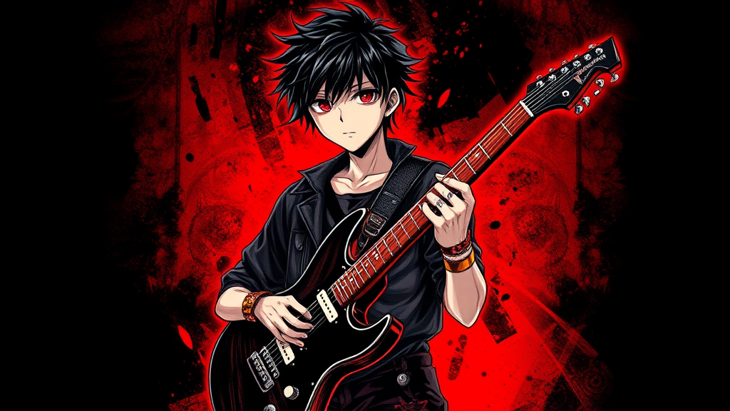 A mysterious Drypoint anime boy standing confidently with a sleek electric guitar, exuding rock star charisma. His edgy appearance features dark black hair styled with subtle spikes, and a punk-inspired wristband adding to his rebellious flair. The portrait captures his stoic and cool attitude, reminiscent of a Davinci drawing, with a focus that is both captivating and enigmatic. Surrounding him is an aura of neon red and intense black, enhancing the overall edgy vibe, set against an elongated 9:16 backdrop that draws the viewer's eye into his captivating presence.