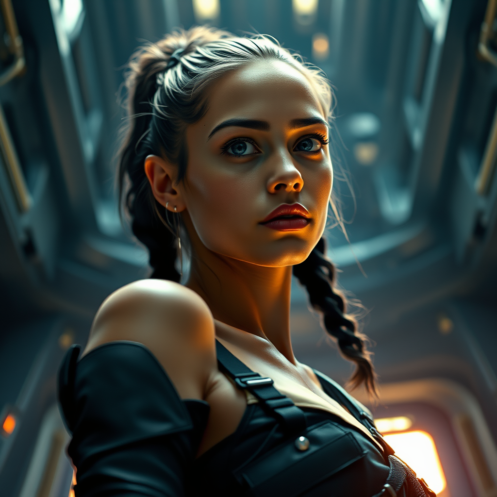 A striking young woman with a slender, athletic build and captivating features, her expression a mix of innocence and concern. She wears a combat sci-fi jumpsuit reminiscent of Battlestar Galactica. The portrait captures her from a three-quarter angle, exuding a photorealistic style that echoes the sci-fi series of the 90s, set against a deep space backdrop. The atmosphere is oppressive, with contrasting elements and dramatic backlighting enhancing the mood. The shot, taken from below, employs a Canon EOS 5D Mark IV DSLR, with an aperture of f/8, shutter speed of 1/250 sec, and ISO 100, resulting in super detailed and hyper realistic textures. The lighting design uses tinted glass effects, emphasizing slender features and a sci-fi aesthetic. The scene is beautifully balanced, with bright and blinding accents adding to the cinematic quality. Elements like gold and rivets add depth, while symmetry underscores the visual appeal. Despite the imaginative sci-fi setting, the image maintains a high level of photorealism and intricate detail, avoiding unwanted distortions or poor quality artifacts.