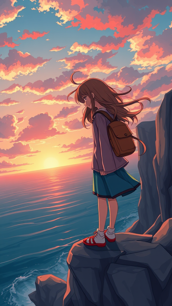 A whimsical anime scene of an adorable girl gazing at a breathtaking sunset over the ocean, her feet planted firmly on a rugged cliff's edge, gentle winds tousling her hair, the vibrant colors of the sky reflecting in her eyes, enhancing the serene yet adventurous mood of the moment.