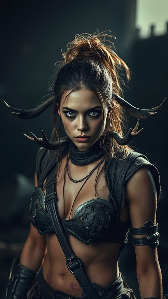 Portrait of a female warrior in a post-apocalyptic landscape, dystopian era, featuring dramatic lighting and cinematic noise, with movie-like photography and prominent shadows. The scene includes elements of mutation with eerie and surreal body distortions, such as extra limbs and missing limbs, giving an unsettling and grotesque appearance, as if caught between transformation and decay.