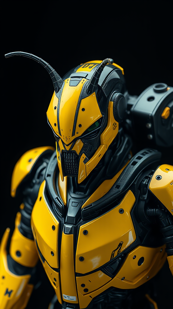 Black and yellow battle mech with intricate detailing, featuring a stunning sci-fi mask, reflective yellow body, and a perfectly integrated jetpack. This insectoid-inspired sci-fi combat mech is crafted with bright yellow polymer armor adorned with identifying marks. Its natural textures and reflections stand out against a black background, creating an eerie and dramatic atmosphere. Designed for top-down viewing, the setup showcases stunning quality captured with ultra high shutter speed, offering a cinematic, hyper-realistic shot in 8k UHD resolution, utilizing Rembrandt lighting for a photorealistic effect. The neutral and blurred background subtly highlights its fearsome, striking presence.