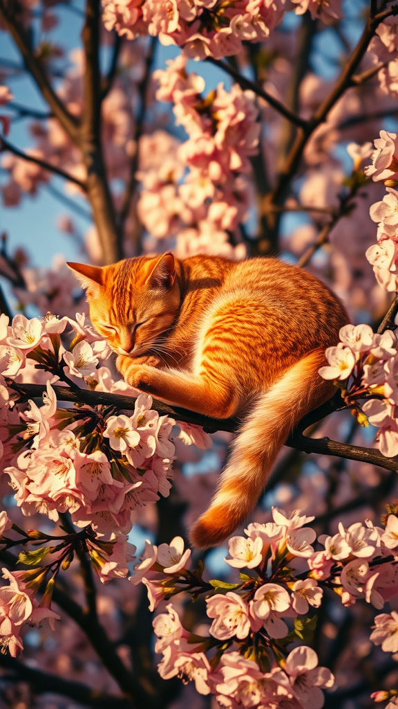 A vivid snapshot captures a ginger tabby cat dozing atop a blossoming tree, its tail draping casually among the blooms, bathed in warm, cinematic lighting, evoking a classic film-like realism reminiscent of nostalgic disposable camera moments.