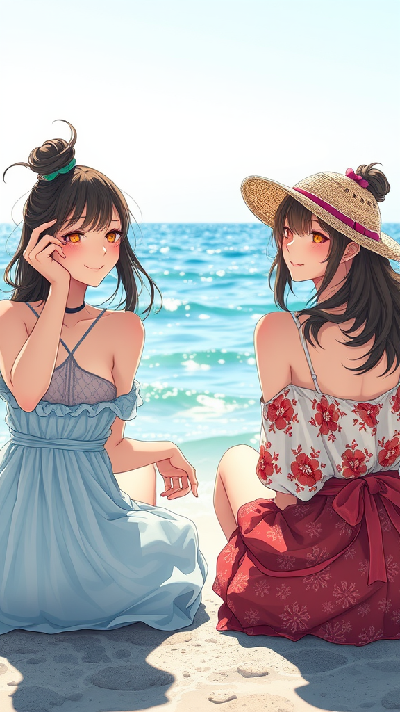 Two women sitting playfully engaging with the photographer at the shoreline| Bright sunny weather| ocean waves in the background| centered composition| key visual elements| intricate details| breathtaking beauty| precise line work| vibrant colors| cinematic feel| inspired by Avetetsuya Studios | influenced by Genshin Impact art style, anime and manga aesthetics in low resolution| text elements| missing fingers| extra fingers and digits| cropped composition| jpeg artifacts| visible signature| imperfect anatomy| extra limbs| hands and feet inconsistencies| disfigured elements| parts out of frame| tiling issues| distorted art| deformed or mutated features| blurred and fuzzy lines| misshaped figures| an off-putting mutant vibe| unattractive elements| presence of watermark and artist name.